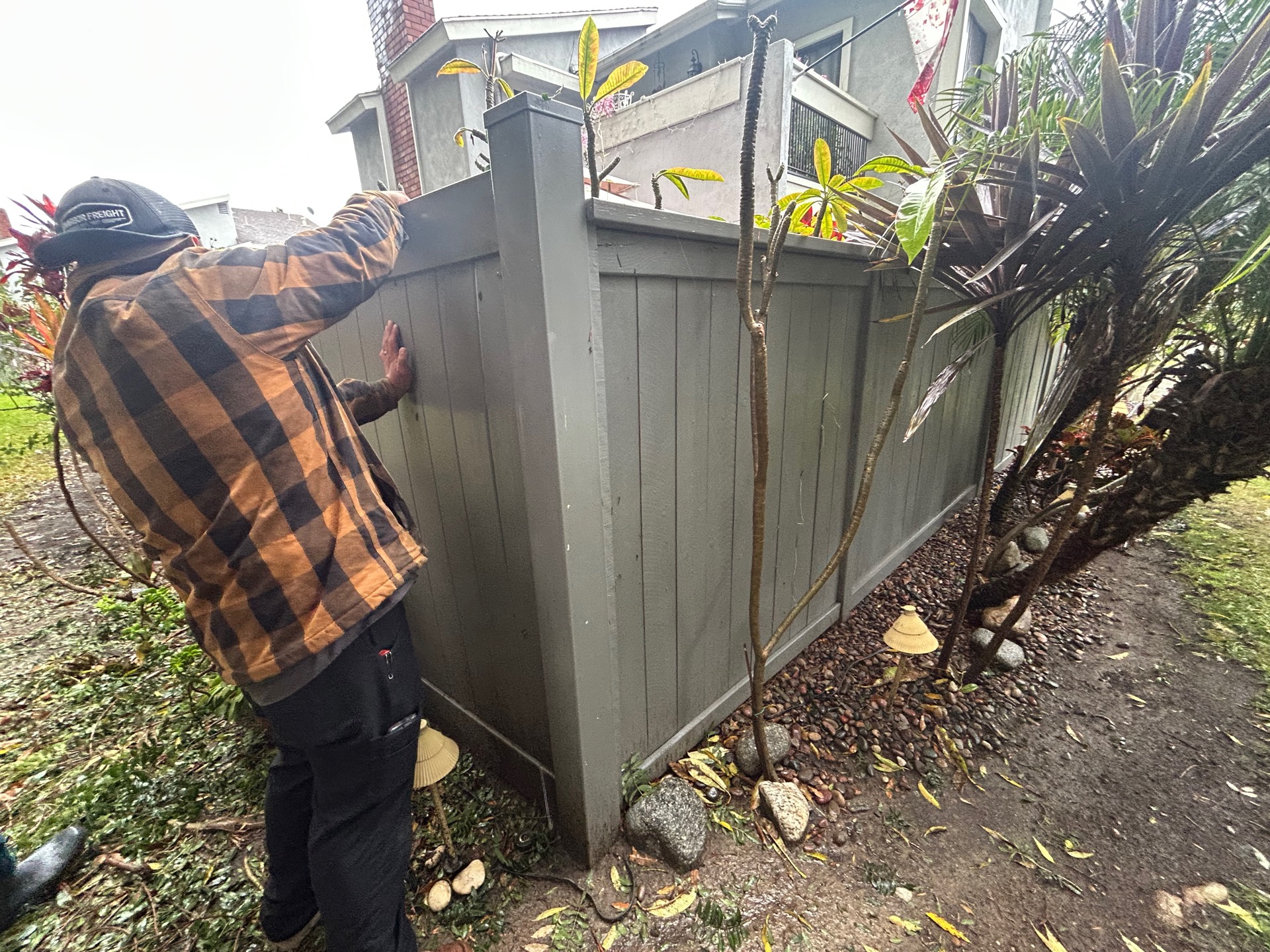 The homeowner reported that a large tree branch fell onto the fence, causing it to tilt and become loose. During the site visit, the vinyl fence was found to be intact and was temporarily stabilized, though it was noted that the fence will need further stabilization as it still moves easily. While onsite, additional water damage was observed inside the home near the living room above the sliding doors, with moisture present and affected building materials identified for removal. No emergency mitigation or repairs were performed at this time, and the job was documented and completed with no further work authorized.