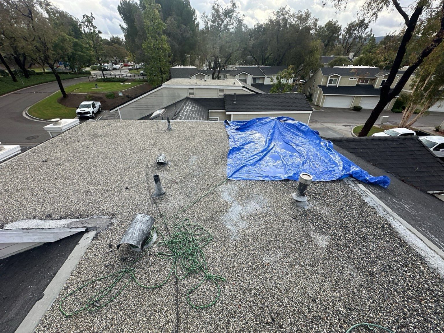 An emergency leak response was performed at the property, where the inspection identified openings at the gravel guard drip edge causing active water intrusion. A temporary patch and roof tarp were installed to cover the exposed underlayment, damaged tiles, and flashing failure in the affected area, helping prevent further water intrusion and interior damage until permanent repairs can be completed.