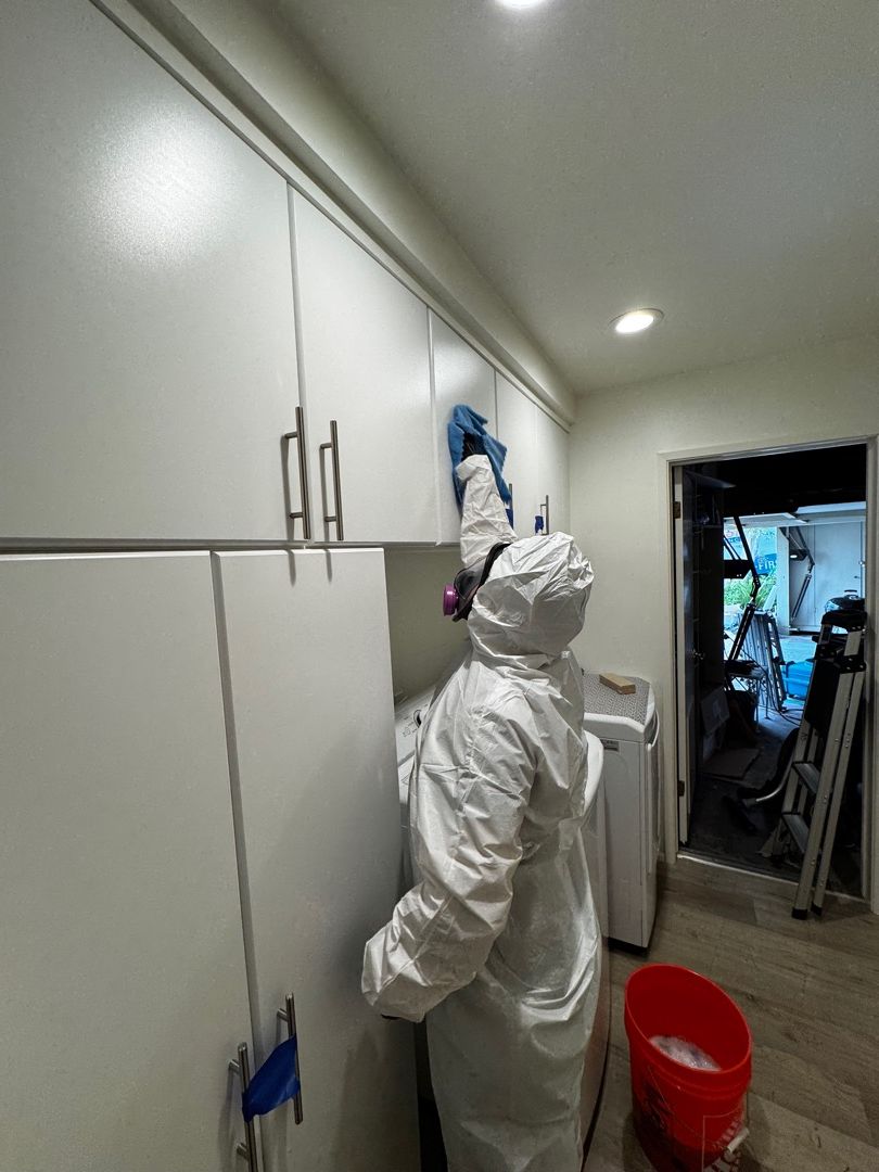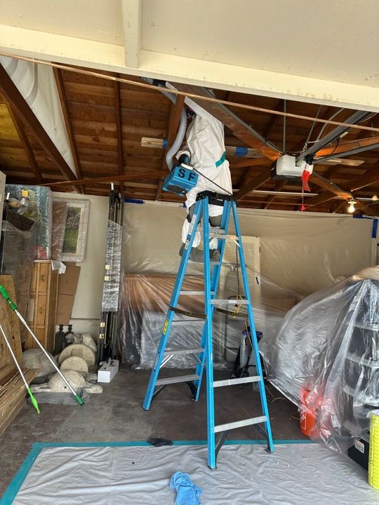 The restoration project involved extensive cleaning due to ash and lead contamination. A detailed email was sent to State Farm requesting clarification on whether porous items—such as rugs, mattresses, and upholstered furniture—should be cleaned or considered total losses, as there is no post-cleaning test that can confirm lead removal. Cleaning followed EPA, OSHA, and Cal/OSHA guidelines. The garage was cleaned first to make space for the contents, followed by thorough HEPA vacuuming, chem-sponge wiping, fogging, and surface cleaning throughout the home. Some coordination issues arose regarding insulation removal and clearance testing, but the work proceeded as planned. All affected areas were cleaned, contents wiped and returned, and equipment set up and later removed.