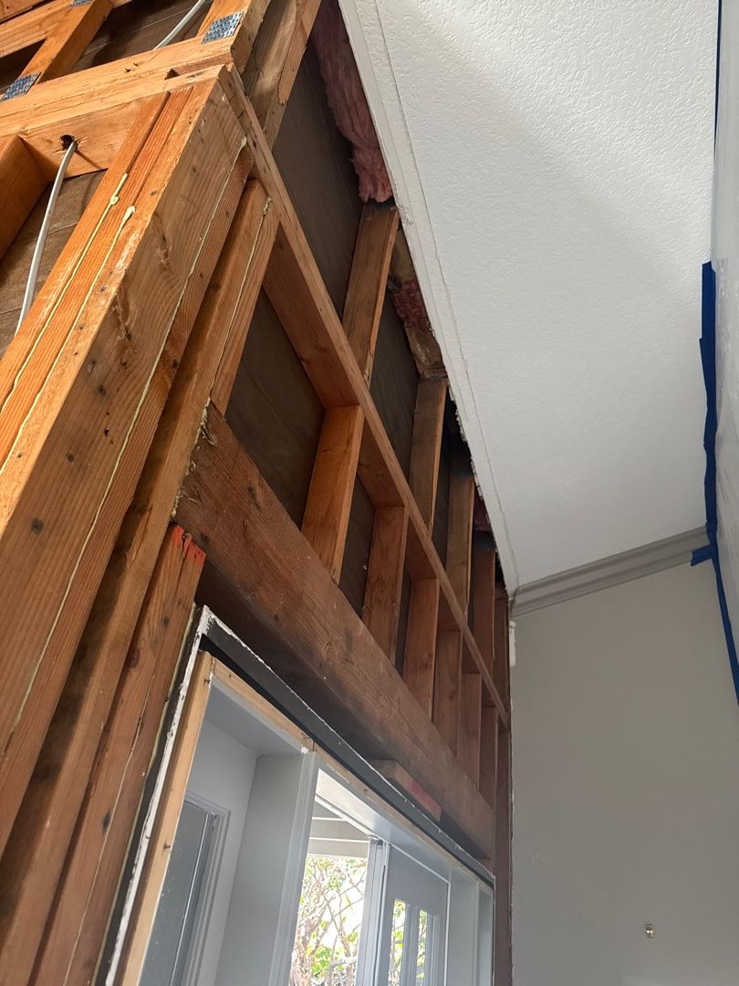 The homeowner reported a roof leak that was temporarily repaired after shingles shifted due to improper nail installation, with initial water impact noted in the living room affecting the wall, door frame, and baseboards, and no standing water present at inspection. Containment was set up in the dining and living areas, affected drywall and insulation were removed, and two entry points were identified: the roof and a deteriorated weep screed at the base of the wall. Additional demolition was required along the west wall, including removal of nails and tucked drywall, followed by detailed HEPA vacuuming and antimicrobial cleaning. Equipment was set up and later removed after the area dried, the homeowner approved the work, and the property was left ready for repairs.