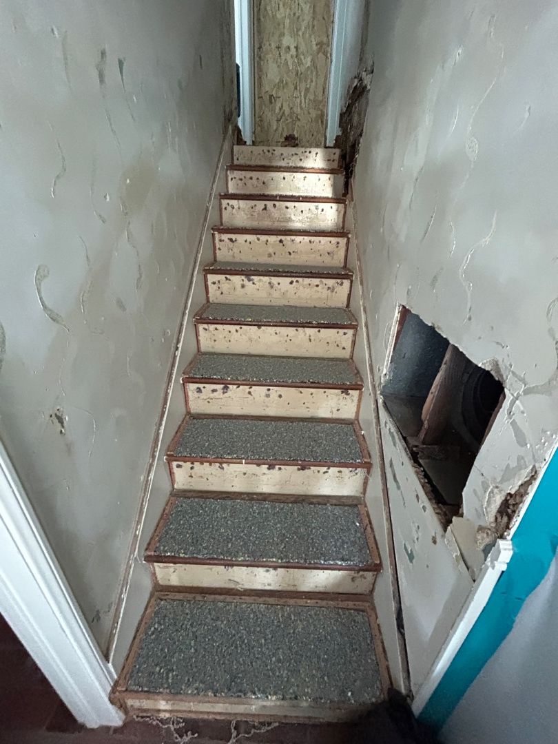 ServiceFirst Restoration was retained to address mold and water damage at a residential property in Laguna Beach, CA. The team set up containment and floor protection across multiple areas, including a staircase, a downstairs bedroom, and an upstairs office. During demolition, severely rotted wood framing was discovered in the stairway, requiring a structural assessment.